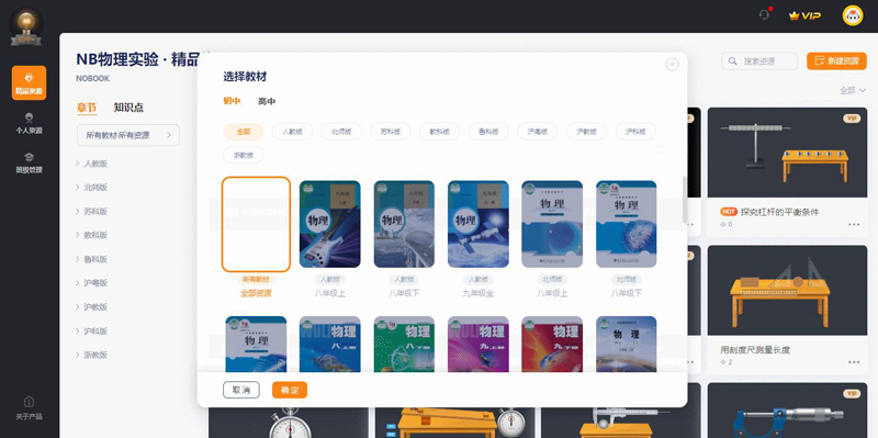 1、在左上角选择对应的学段,点击右上角的新建资源,选择对应的模块,即可进入到相关的实验界面,以物理电与磁模块为例;
