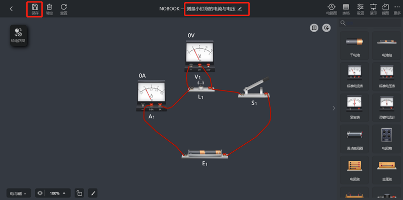 4、点击标题可以修改实验名称,将实验保存为对应的名字,点击“保存”实验,即可将实验保存到个人资源当中;