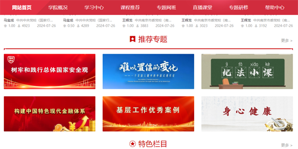 包含课程中心、专题网班、个人空间、通知公告、干部选学、文件法规、问卷调查、学习排行、支持服务等功能,极大地便利了学员的学习。
