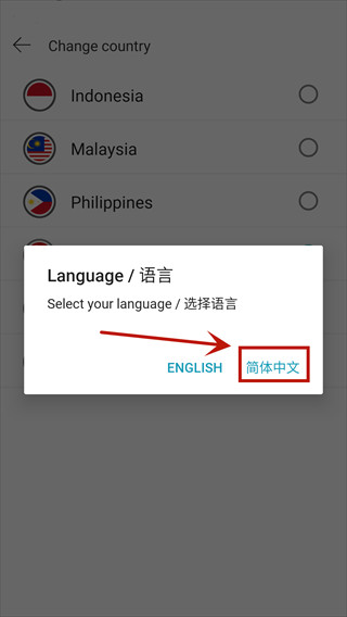 3、点击国旗图标将地区设置为新加坡,点击continue后,在弹出的对话框内选择简体中文即可设置成功。